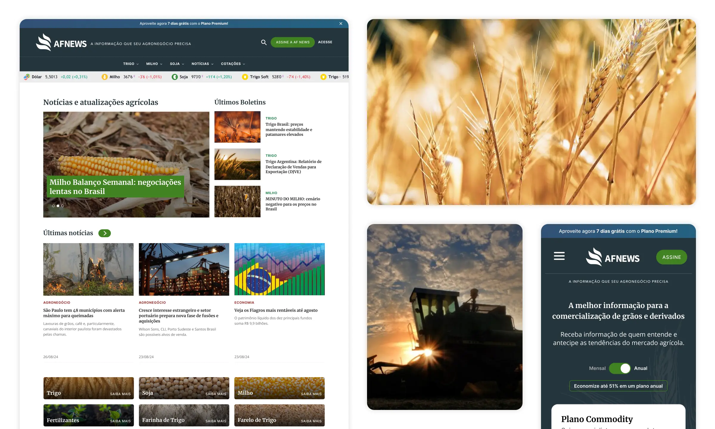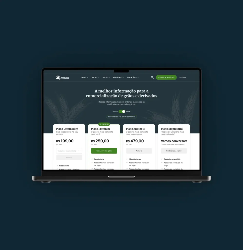 A AF News necessitava de uma plataforma que não apenas entregasse notícias relevantes, mas também oferecesse um sistema de assinatura eficiente e intuitivo. Desenvolvemos um portal robusto, focado em atualizações rápidas e na experiência do usuário. Com a implementação dos planos de assinatura, garantimos que os usuários pudessem acessar conteúdos exclusivos e manter-se sempre informados sobre as tendências e acontecimentos do agronegócio.