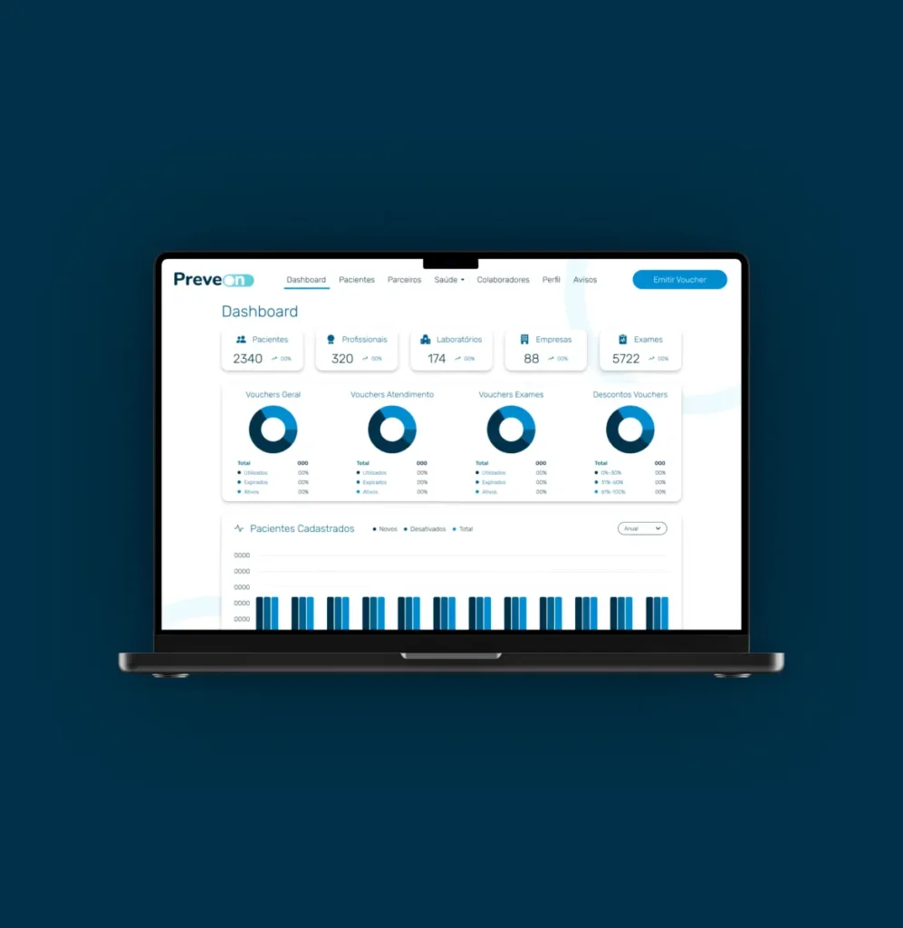 O desafio era criar uma plataforma que integrasse profissionais de saúde e pacientes de maneira fluida, enquanto oferecia um cartão de desconto para facilitar o acesso a serviços de saúde. Nossa solução foi desenvolver um sistema intuitivo, onde os profissionais podem controlar o histórico dos pacientes, permitindo um acompanhamento mais eficiente. A plataforma também permite que os usuários encontrem profissionais facilmente e aproveitem os benefícios financeiros oferecidos pela PreveOn, tudo com segurança e praticidade, impulsionando a prevenção e a qualidade de vida.